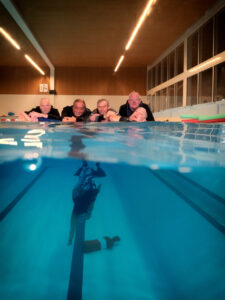 De freedivers nemen ook een extra lange hap lucht om samen met haar op de foto te poseren. Ik schiet (als freediver) meerdere malen in de lach (niet handig onder water kan ik je zeggen) en probeer me te concentreren want hoe krijg je negen mensen allemaal tegelijk onder water en het best op de foto!? Wanneer de foto’s verschijnen op mijn schermpje, moet ik ontzettend lachen, wat een chaos! Vandaag hebben we ook Erik, voorzitter van de NOB, als deelnemer aanwezig. Hij slaagt voor de opleiding tot Pool freediver! Proficiat Erik!