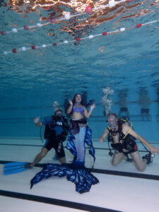Mensen zwemmen in banen, er zweven een paar duikers onder water, mannen met rugzakken gevuld met lood zijn bezig met hun ‘survivaltocht’ en als klapstuk op deze woensdag zwemt Mermaid Najda haar ronde in ons zwembad Optisport in Almere Poort. SWL bruist van de activiteit!