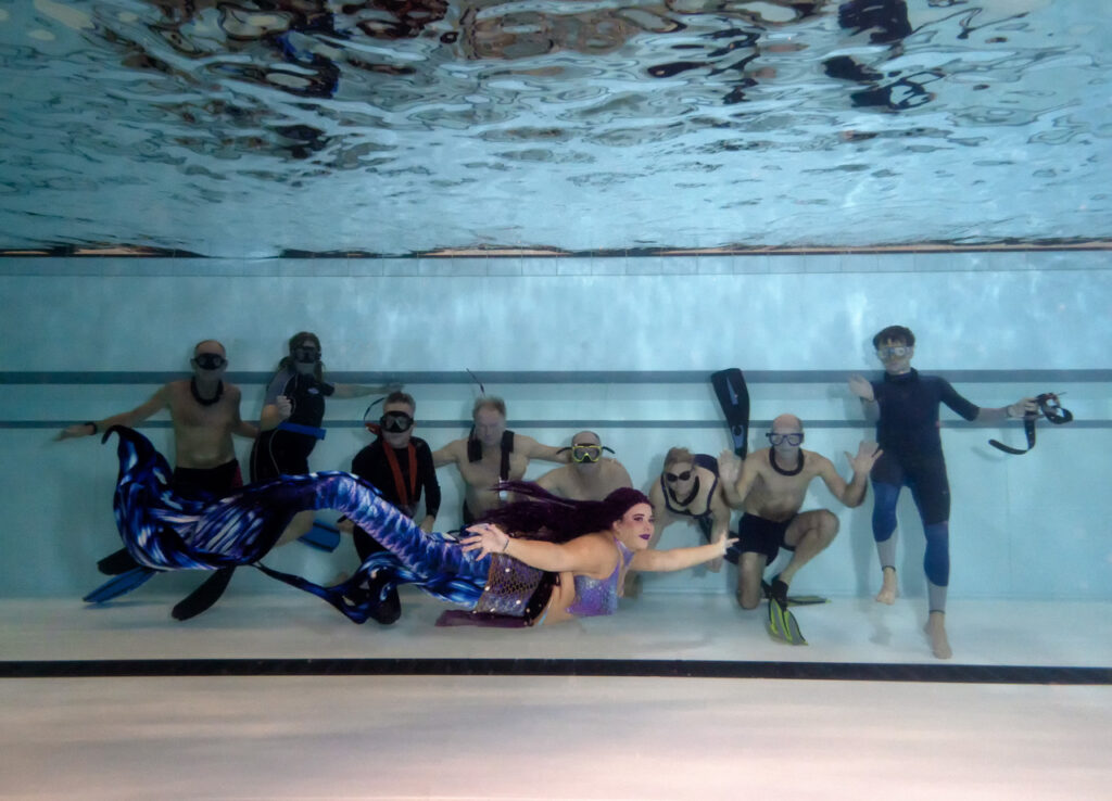 Mermaid Najda en ik kennen elkaar van een fotoshoot met Rob Aarsen. Zodra we in het water liggen, gaan we aan de slag. Duikers willen graag met haar op de foto en Najda besluit onder de mat door te zwemmen waar een aantal ‘survivalspecialisten’ met hun rugzak met lood even op adem komen voordat ze hun ‘slachtoffer’ moeten opduiken. Ze nemen instructeur Willem mee op sleeptouw als ‘slachtoffer’.