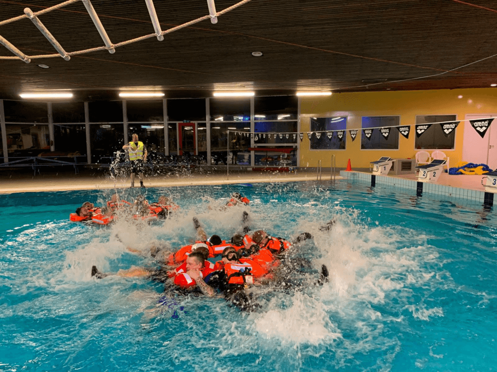 Elk jaar duiken we met z’n allen het zwembad in voor ons GetWet‑event. We gooien een écht reddingsvlot te water, dat zich vanzelf spectaculair opblaast. Met een reddingsvest aan doen we allerlei oefeningen om te ervaren hoe het is om samen te overleven op zee. En om het helemaal af te maken, gaat het licht uit in het zwembad en zetten we de brandslang aan om een flinke regenbui na te bootsen. Zo voelt het net even écht.